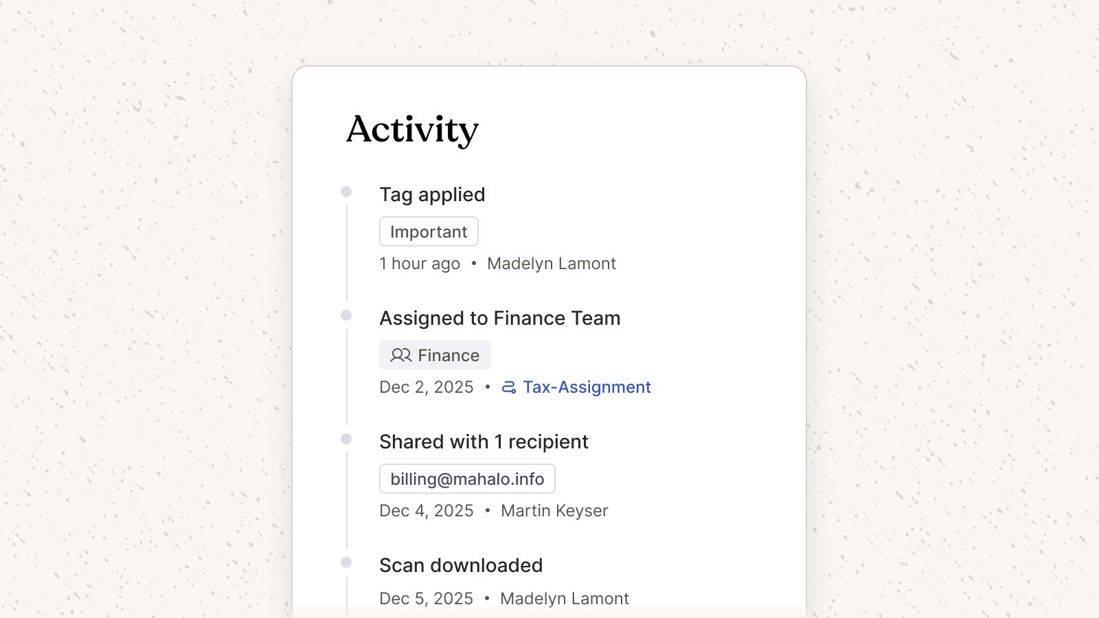 Activity logs now surface even more actions, and the user responsible for that action. Specifically, you can now see which users took the following actions on a piece of mail: team assignment, tag, archive, download, share, and print.