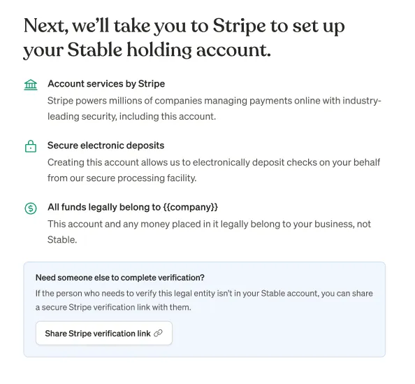 You can now invite any authorized employee to complete the Stripe verification process for Electronic Check Deposits — no Stable Dashboard access required. This flow will allow company officers and other team members who don't typically login to Stable to seamlessly complete verification. Just share a secure link and get verified faster.