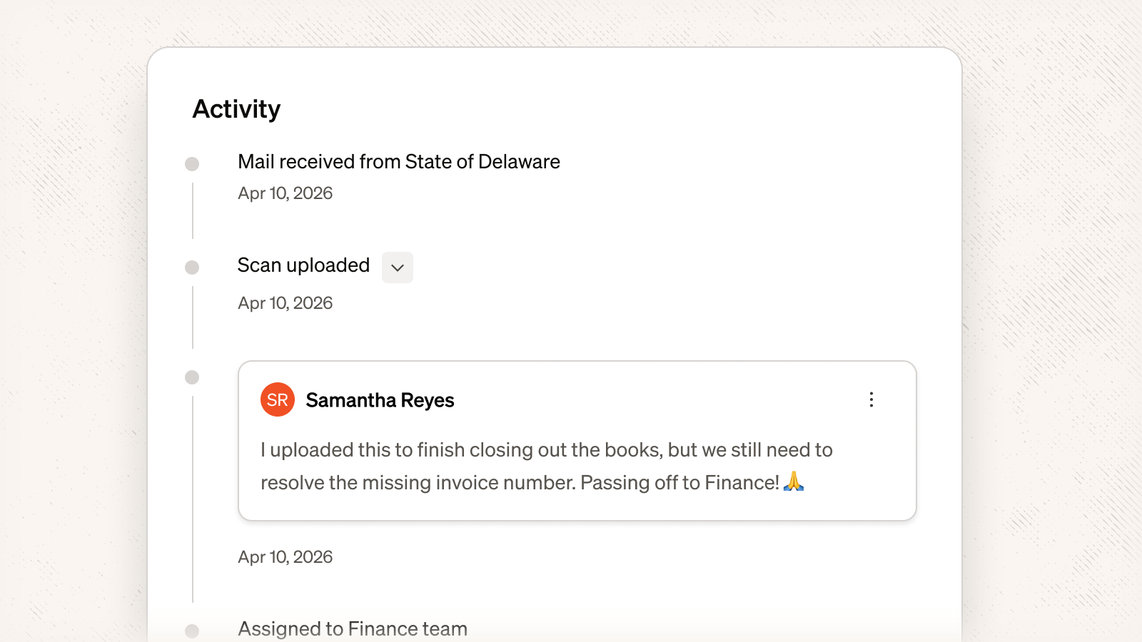 You can now add notes directly to mail items. Notes empower your team members to work directly within your mailroom to share context, take action, and bring items to resolution more quickly.